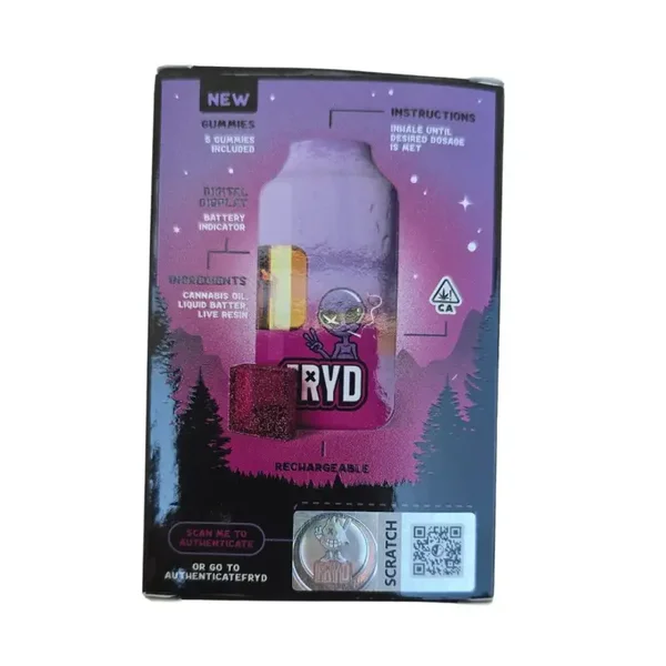 Marca: FRYDSabor/strain: Galactic GrapeTipo: IndicaClase: Live resinContenido: 3000 mg + 5 gomitas